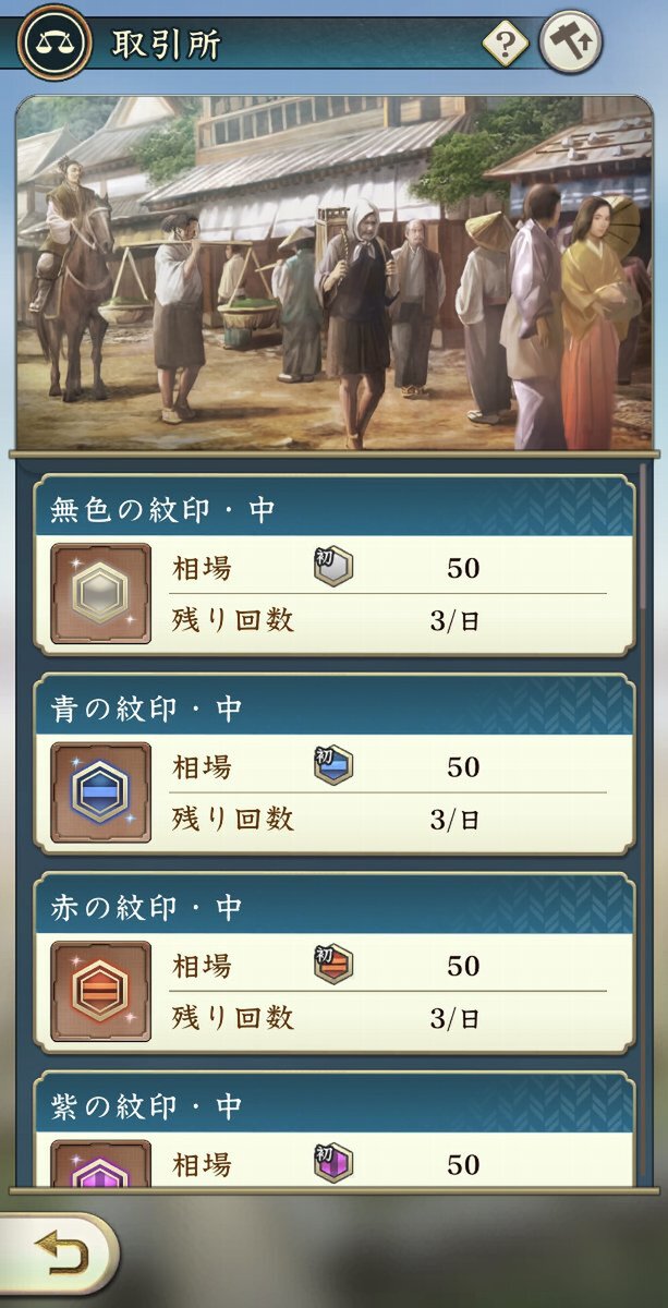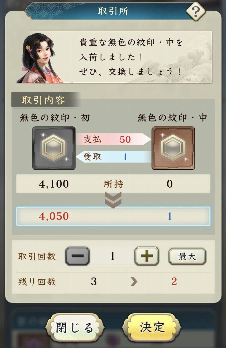 資材から兵糧への交換だけでなく、各種紋印・初から各種紋印・中への交換や、兵糧から金銭への交換など、取引可能なアイテムの種類が追加された。