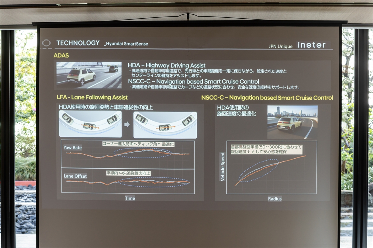 高速道路では運転支援がバッチリ効きます。しかも、日本の高速道路とユーザーが好むようコーナーの振る舞いをチューニングしているそうです(のちほど体験予定)。ヒョンデの本気を感じずにはいられません。