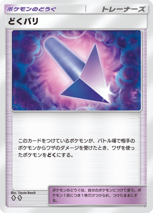 ポケモンのどうぐは、どくバリがマスト。ベンチにウツロイドがいるだけで、どくバリの付いたポケモンを攻撃するのをためらわせる効果もあります。