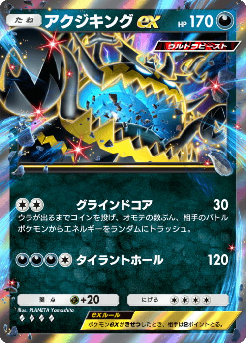 メインとなるのはアクジキングex。HPは170と耐久力も申し分なし。逃げエネは4と重いですが、万が一最初の1体に選ばれてしまった場合でも、2エネから打てる「グラインドコア」は、ダメージこそ30と高くはないですが、攻撃のたびに裏が出るまでコインを投げ、表の回数分だけ相手のエネを剥がすというロケット団のしたっぱを無限に使えるといった強力なワザを持っているので、メインワザである「タイラントホール」が使えるようになるまで十分戦えます。