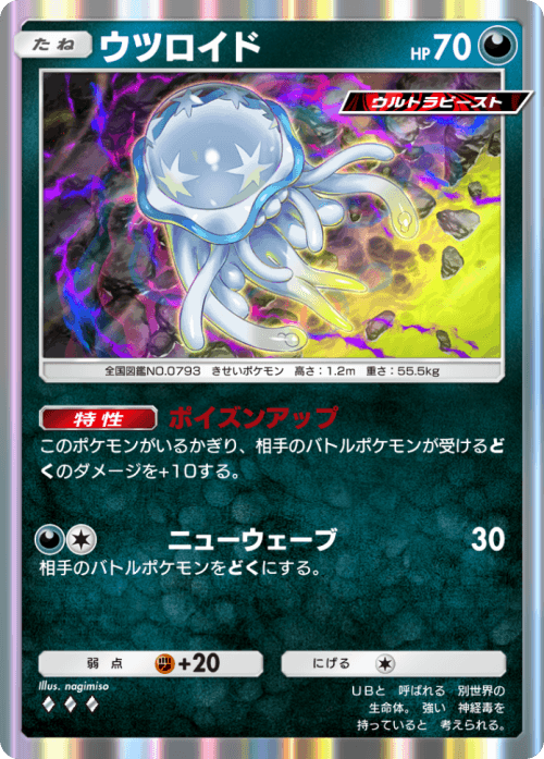 ウツロイドは、先鋒のアーゴヨンをサポートするためのポケモン。特性の「ポイズンアップ」は、このポケモンがベンチにいるだけでどくのダメージを+10してくれ、2体いれば+20にすることもできるので、毒攻撃がかなり効きます。