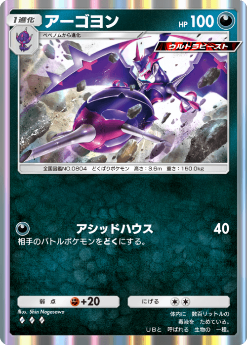 というわけで、このデッキの戦い方ですが、理想としては前半はアーゴヨンとウツロイドで毒ダメージを駆使して戦いつつ、ベンチでアクジキングexを育てます。とはいえ、カードの紹介にも書きましたが、たとえアクジキングexのような攻撃も逃げも重いポケモンが最初に選ばれてしまっても、テッカグヤで自在にベンチと入れ替えることができるのがウルトラビーストデッキの強みです。ぜひ、試してみてください。