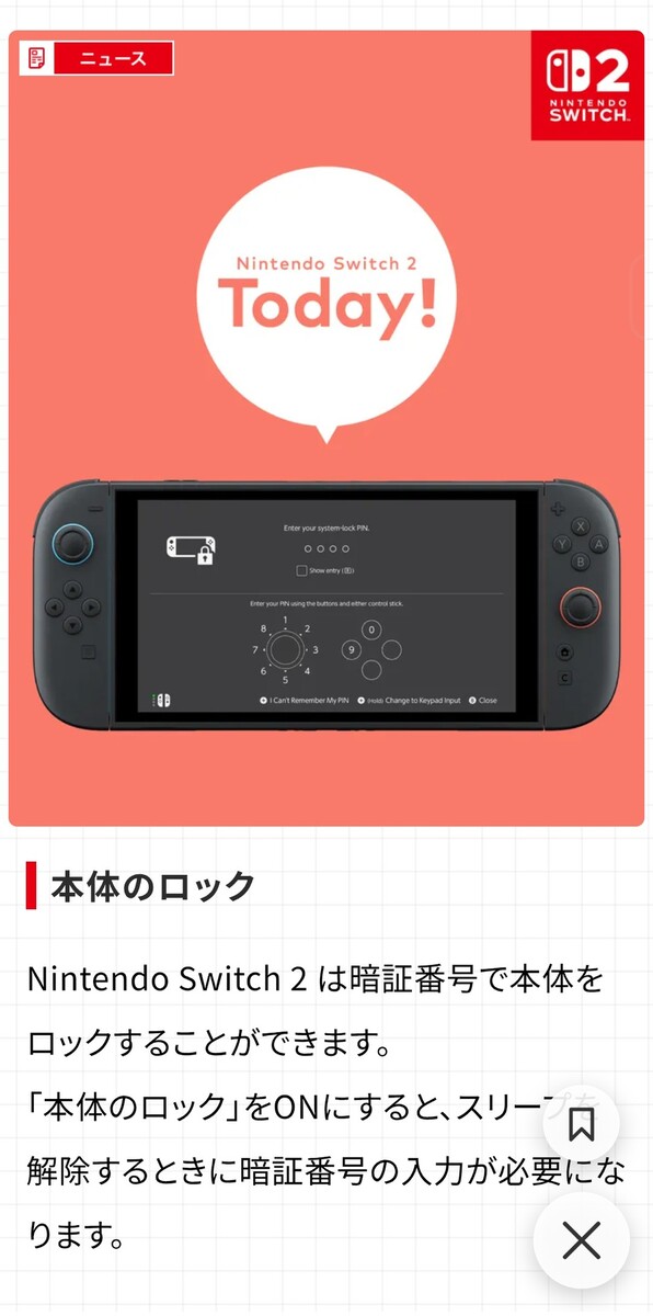 これは、同社のアプリ「Nintendo Today!」のニュースによるもの。あらかじめ暗証番号を設定しておくことで、スリープ状態から復帰する際にロックをかけられるという機能だ。