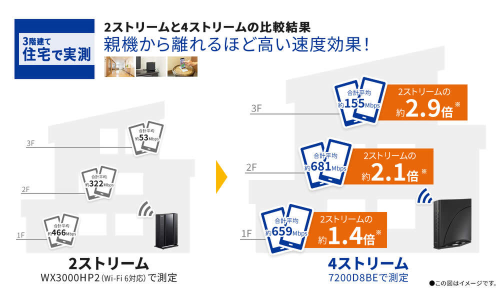 Aterm 7200D8BEは計8ストリーム対応で、より高速かつ快適なWi-Fi接続を実現。これは、現在発売中の同等クラスのWi-Fi 7ルーターや従来規格で採用している2~6ストリームよりも多い仕様だ。