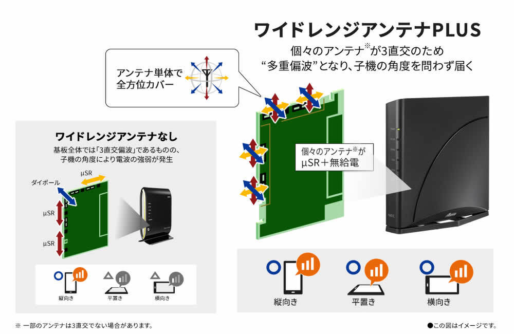 Wi-Fiルーターの繋がりやすさを左右するのがアンテナ。Aterm 7200D8BEは、NECの独自技術のワイドレンジアンテナPLUSを搭載し、360°まんべんなく電波が届く。基盤の4カ所に「3直交アンテナ」を配置することで、スマホなどの向きを気にせず安定した通信が可能。アンテナ内蔵なので、インテリアの邪魔をせず、お掃除も簡単にできるのもメリットのひとつ。