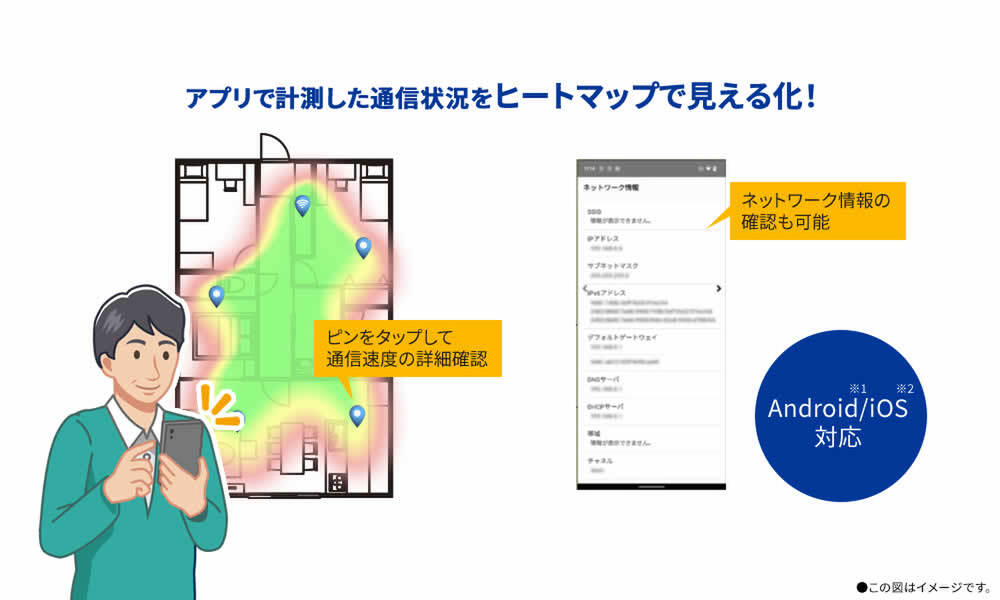 さらに、Aterm 7200D8BEのスマホアプリAterm ホームネットワークリンクのヒートマップ機能を使えば、自宅の電波の良くない場所をヒートマップで確認できる。例えば、3階の仕事部屋などでたまにWi-Fiが切れてしまうことがある場合は、ヒートマップ機能で中継に適した場所を探して、もう一台Aterm 7200D8BEをメッシュ中継機として追加することで、Wi-Fiエリアを拡大できる。