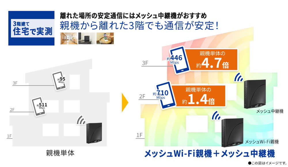 もし、2階・3階建ての住宅で電波が届きにくいなどある場合は、メッシュ中継機能が便利だ。これは親機のWi-Fiルーターに、もう一台Wi-Fiルーターをメッシュ中継機として追加することで、より広いエリアをカバーできる、近年注目されている機能だ。