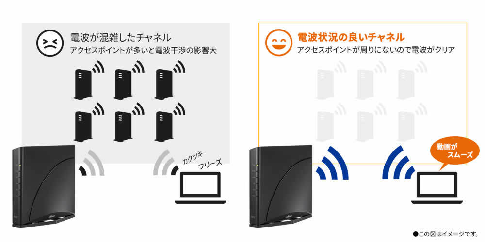 マンションや都心部など多くのWi-Fiルーターが設置されている環境では、周波数帯のチャネル被りで速度が落ちることも。Aterm 7200D8BEは、オートチャネルセレクトにより、自動的に空いているチャネルへと切り替えて快適な通信を利用できる