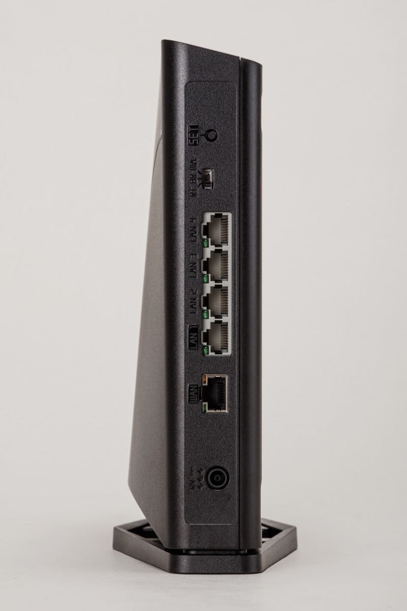 本体背面にはWPSボタンと本体動作切り替えスイッチを搭載。WANは10Gbps対応で10ギガ光回線サービスの速度を最大限に活かせる。LANは1ポートが2.5Gbpsに対応しており、ゲーミングPCとLANケーブルで接続することで、より低遅延かつ安定した通信環境を実現できる
