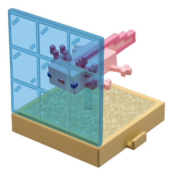 マスコット入り入浴剤1個と台座がセットになっており、キャラクターマスコットは「マインクラフト」のゲーム内に登場するウーパールーパー(ピンク)や熱帯魚(クマノミ)など全6種が用意されています。