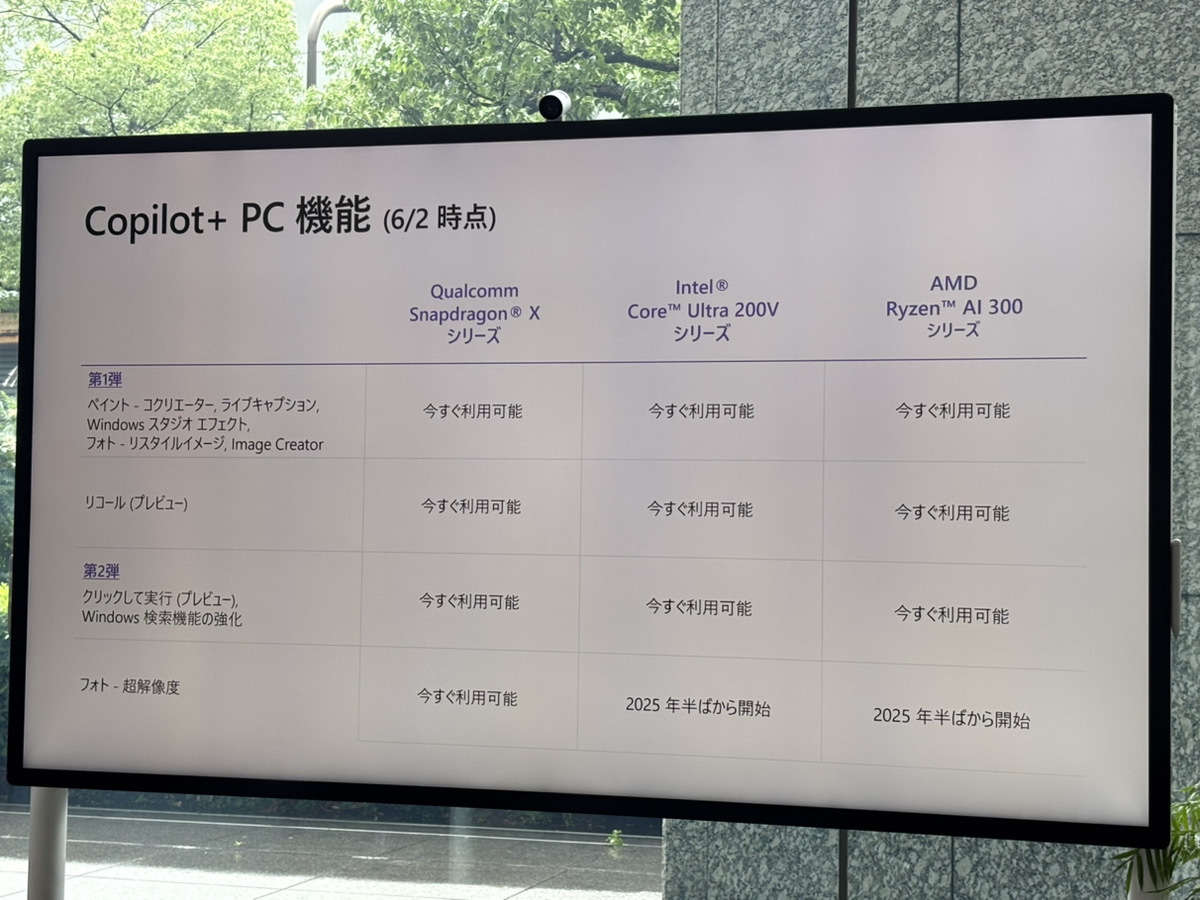 なお、リコールやClick To Doといった機能は、Snapdragon Xシリーズのほか、Intel Core Ultra 200Vシリーズ、AMD Ryzen AI 300シリーズなどで利用可能となる。