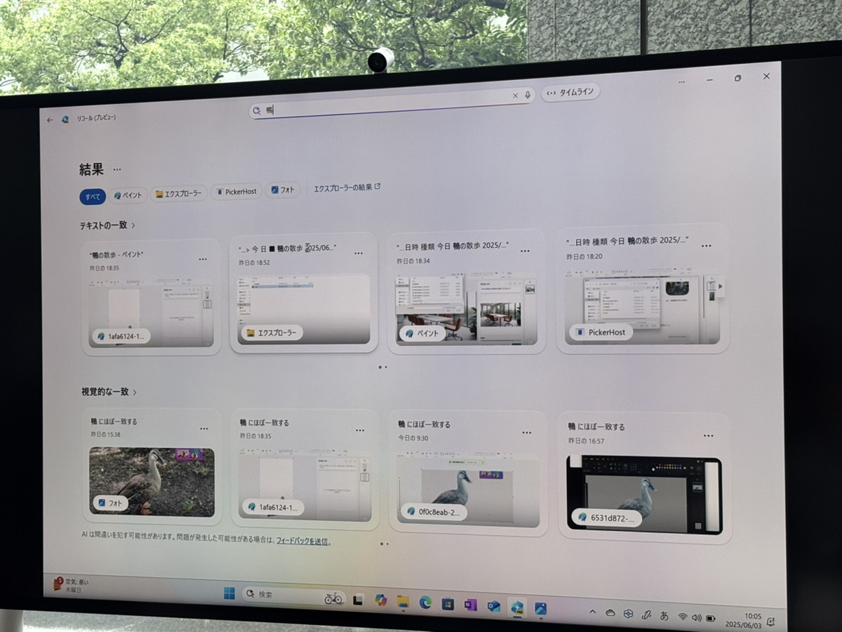 リコール機能を使って、「鴨」と関係のある画像や資料をPC内から素早く検索。