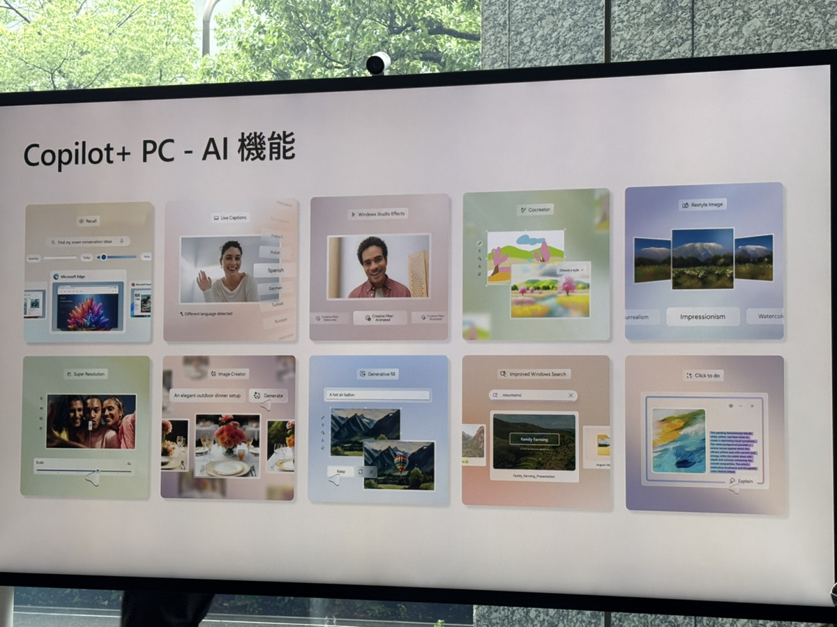 会場では、Copilot+ PCの目玉機能のひとつ「リコール(Recall)」をはじめ、さまざまなAI機能のデモも実施された。