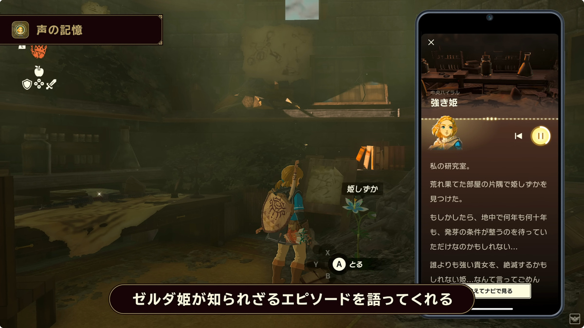 また、スマホアプリ「Nintendo Switch App」で使用できるゲーム連携サービス「ZELDA NOTES(ゼルダノーツ)」もウリの1つだ。訪れたことのない場所への音声ナビや、名所の知られざる物語をフルボイスでゼルダ姫が語ってくれる。この新要素がプレイし直すモチベに!