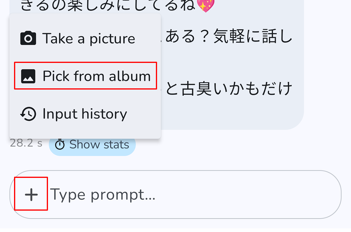 プロンプトウィンドウの左端にある「+」から「Take a picture」または「Pick from album」を選び写真を選択しよう。