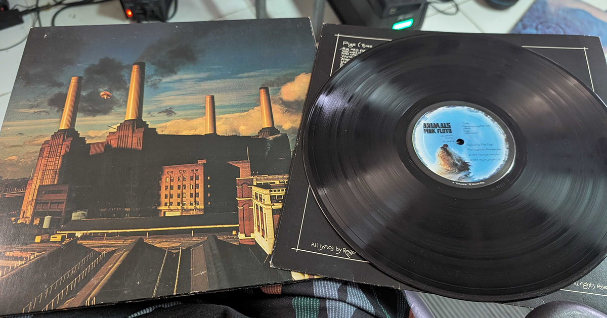 もう1問出題。筆者が50年遅れでハマっている「ピンクフロイド」というバンドの「ANIMALS」というアナログレコードを見せてみると。