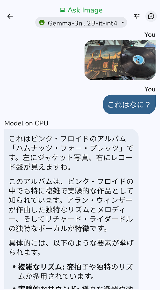 ハルシネーションの問題は残るが、インターネットに接続されていない状態でも画像を使った質問をAIにできるのは新鮮だ。