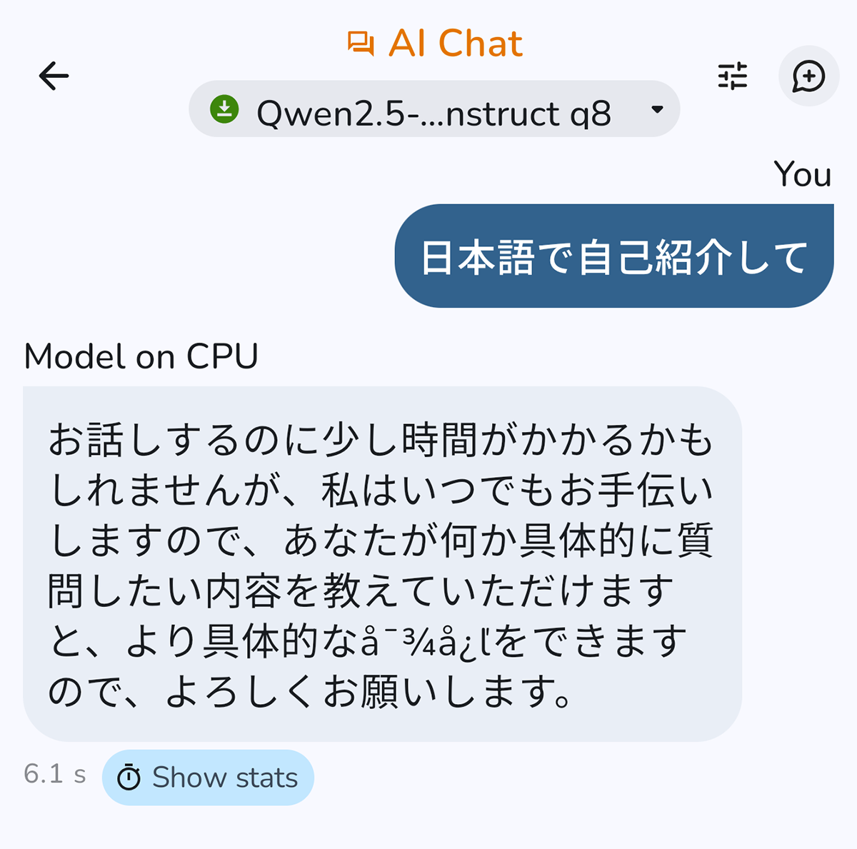 多少文字化けすることもあるが、そのぶん応答速度が早い。簡単なおしゃべりならこちらでも十分いけるだろう。