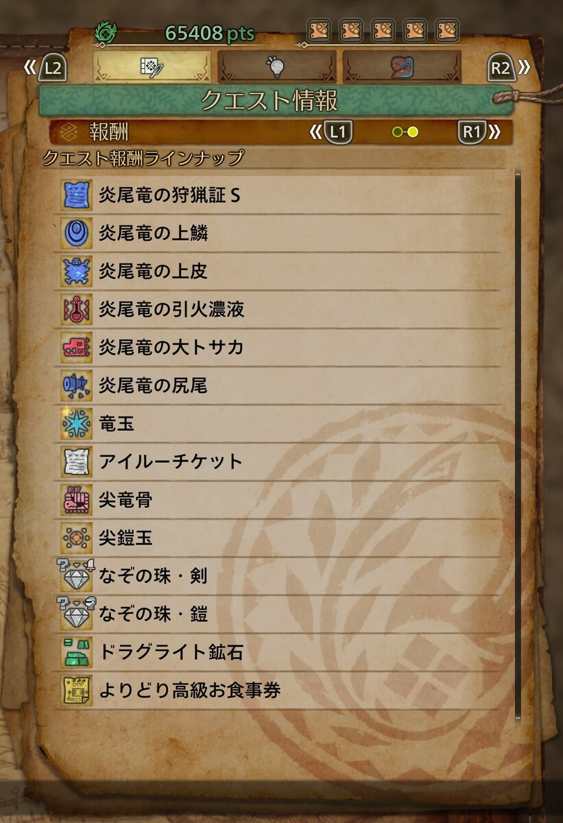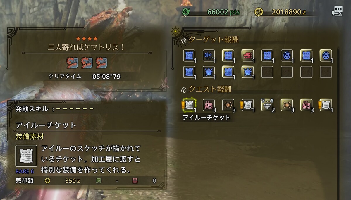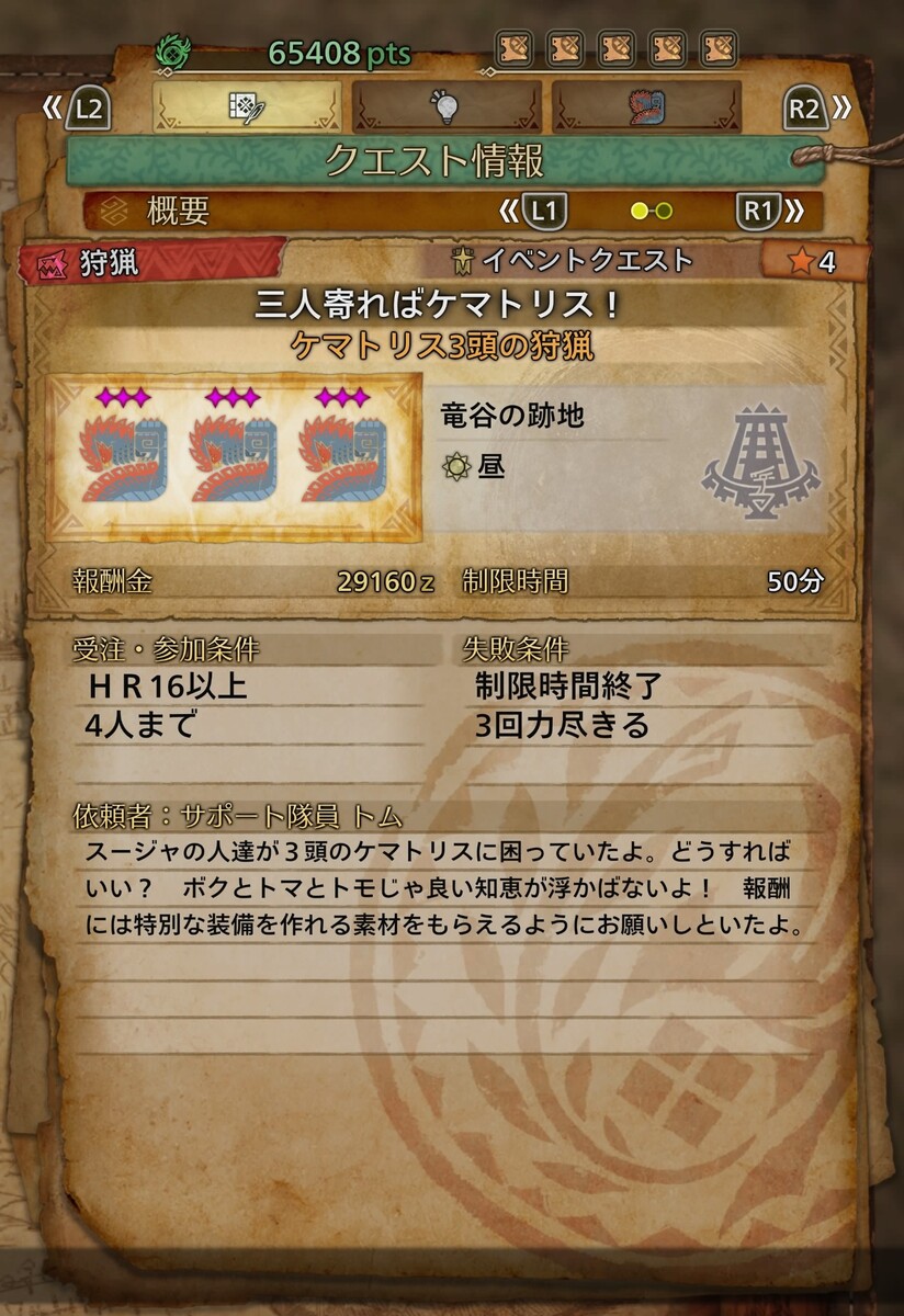 クエスト内容は難易度★4「ケマトリス」3頭の狩猟。竜谷の跡地なので、移動の手間もなく楽に狩猟できた。HR16から受けられるので、上位になりたてでも少しストーリーを進めれば挑める。