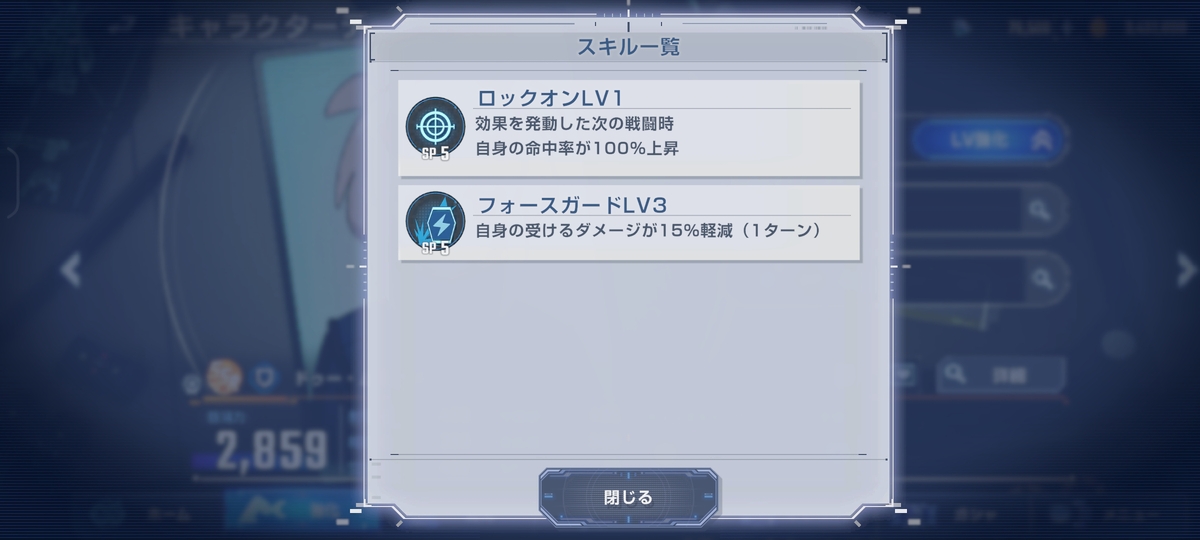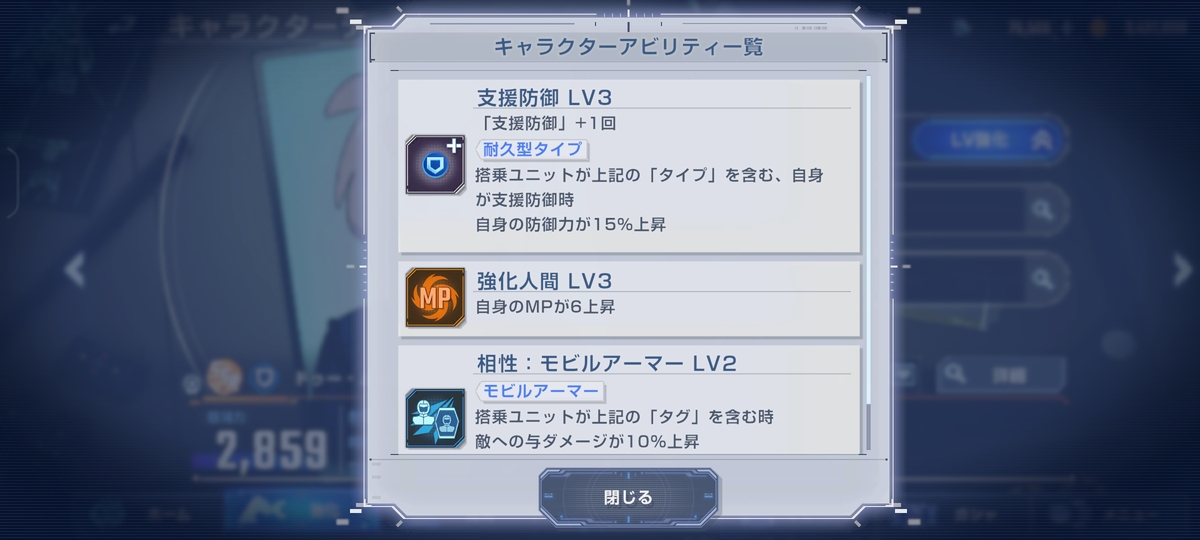 パイロットとしての性能は、防御タイプでスキル「フォースガードLV3」持ちと、壁役として十分機能するレベル。相性のタグは「モビルアーマー」なので、幅広い適正があると言えるだろう。