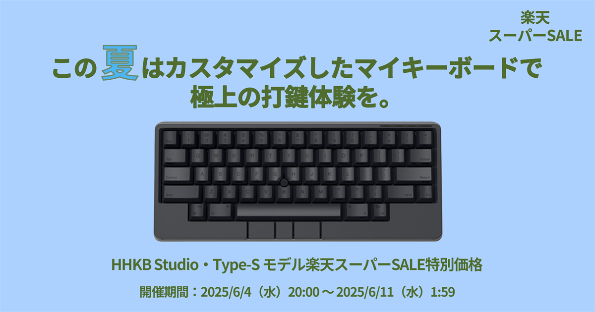 PFUは、2025年6月11日(水)1時59分まで「この夏はカスタマイズしたマイキーボードで極上の打鍵体験を。」をテーマに、楽天スーパーSALEにてHHKB Studio、HHKB Professional HYBRID Type-Sを特別価格で販売中。
