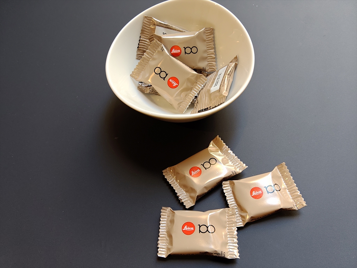 このラウンジではコーヒーを無料でいただけるのですが、スナックとして置いてあったチョコレートにしっかりとライカ100周年のロゴが入っていました。これはこれで記念品になりますね。