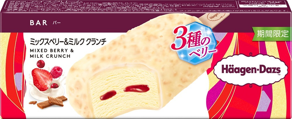 ハーゲンダッツの新作、バー「ミックスベリー&ミルク クランチ」は、ハーゲンダッツがこだわったミルクと3種のベリー(ストロベリー・ラズベリー・クランベリー)が織りなす、濃厚ながらも爽やかな味わいのバー。