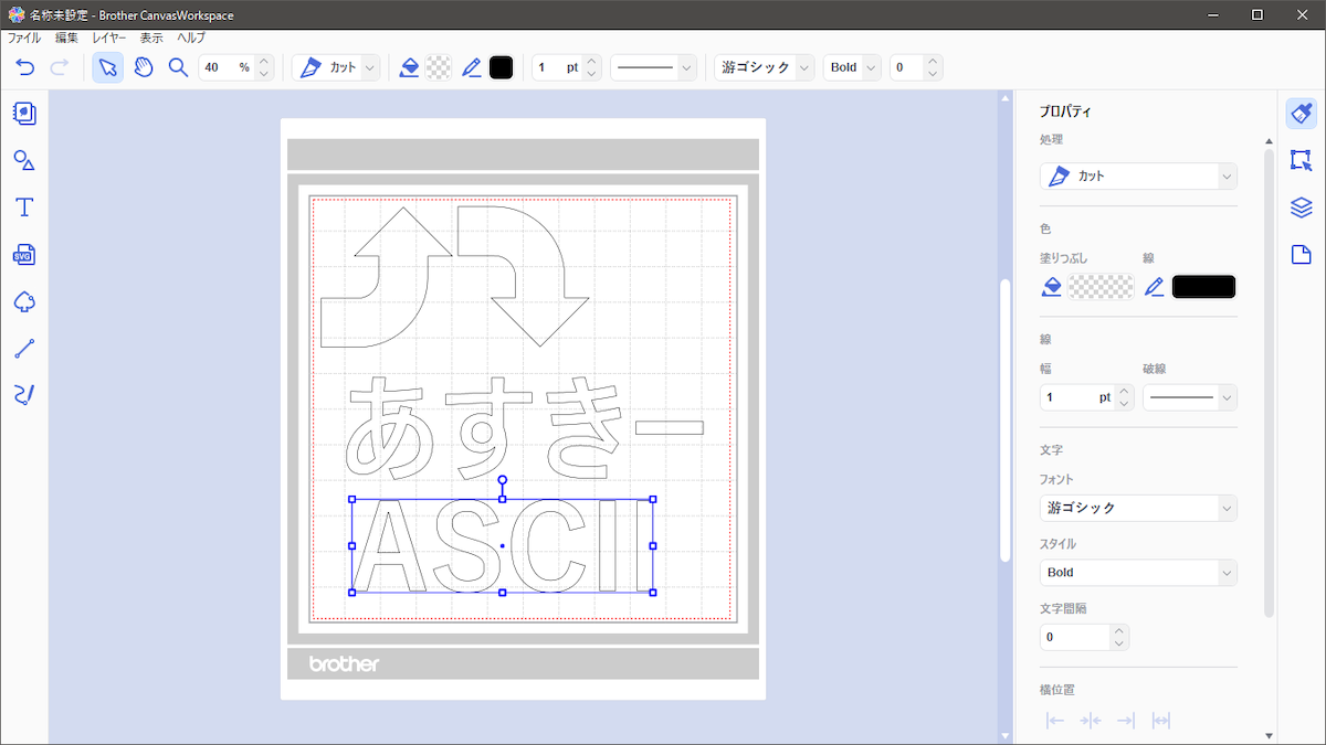 作成機能としては、既存の図形を並べられるほか、文字の入力、画像のトレース、自由曲線などが利用可能。本体の編集機能では、文字はアルファベットに限られていましたが、このソフトでは日本語にも対応しています。もちろんフォントも選べるので、かなり自由度が高くなっています。
