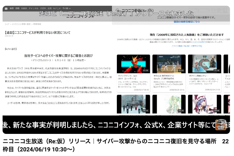 2024年6月8日、ドワンゴはランサムウェアを含む大規模なサイバー攻撃を受け、「ニコニコ」全サービスの停止を余儀なくされました。