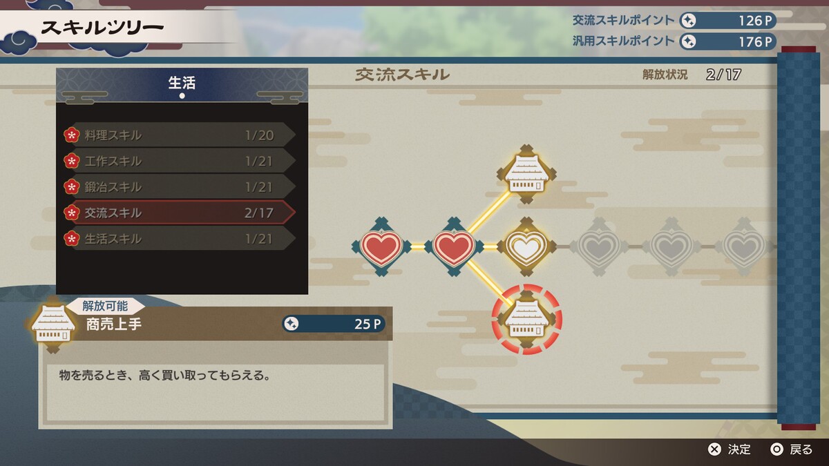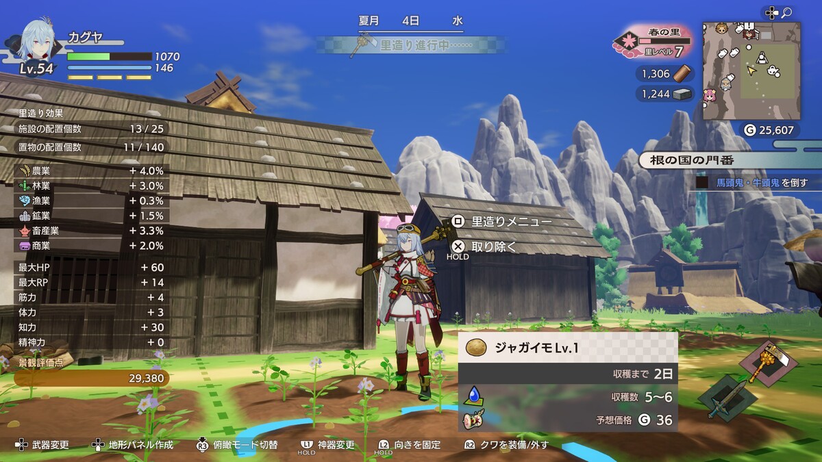 里ごとに指定された開拓エリアの範囲を自由にカスタマイズできる「里山づくり」。住人の住む家を増やしたり、商店を建てて道を舗装して商売っけのある里にしたり、一面「畑づくし」なんてことも可能。自由ってスバラシイ。