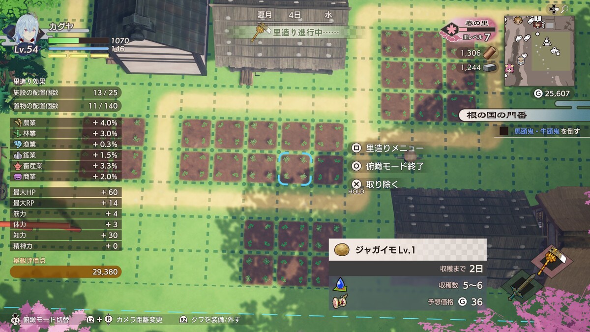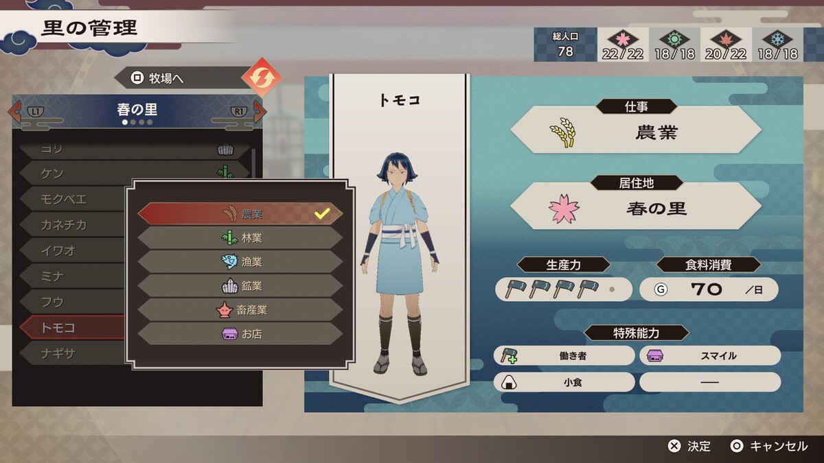 とは言え、物語が進めば作物のレベルアップをしてくれるNPCも登場するので、一概に邪魔者扱いはかわいそう。管理する里が増えると手も足りなくなるため、適切に使い分けるといい。
