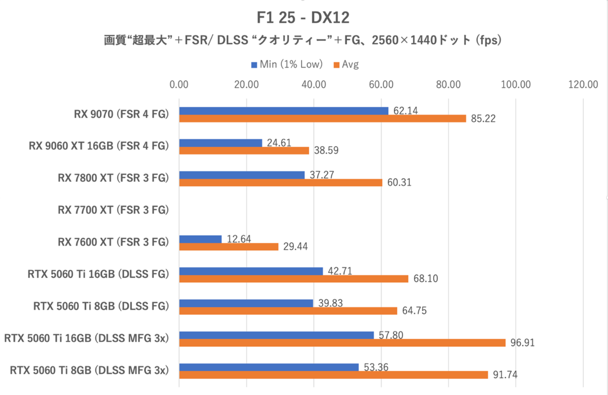 つい先日公開されたばかりのF1 25は画質「超最大」としパストレーシングを有効化、異方性フィルタリングは16x、FSR/ DLSS「クオリティー」およびフレーム生成(MFG 3xも含む)も追加。ゲーム内ベンチマークを“ラスベガス&ウェット”設定で再生した際のフレームレートを計測した。