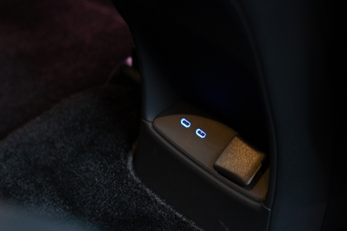 後席はラグジーだけれど、思っていたよりは狭いという印象。ドライブシャフトが通る都合、センタートンネルはかなり高めです。USB Type-Cのほか、DC12Vのサービスアウトレットを用意しています。