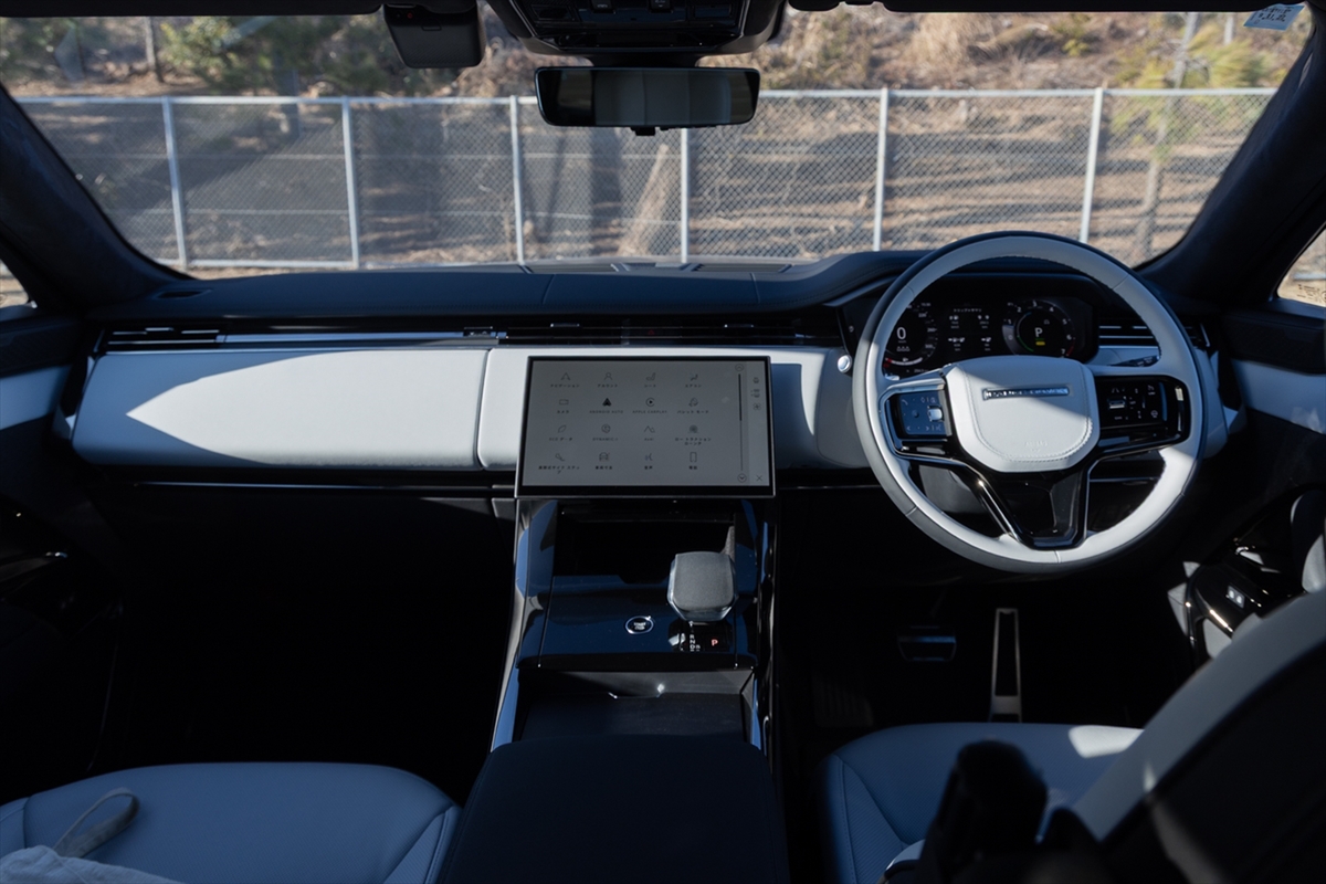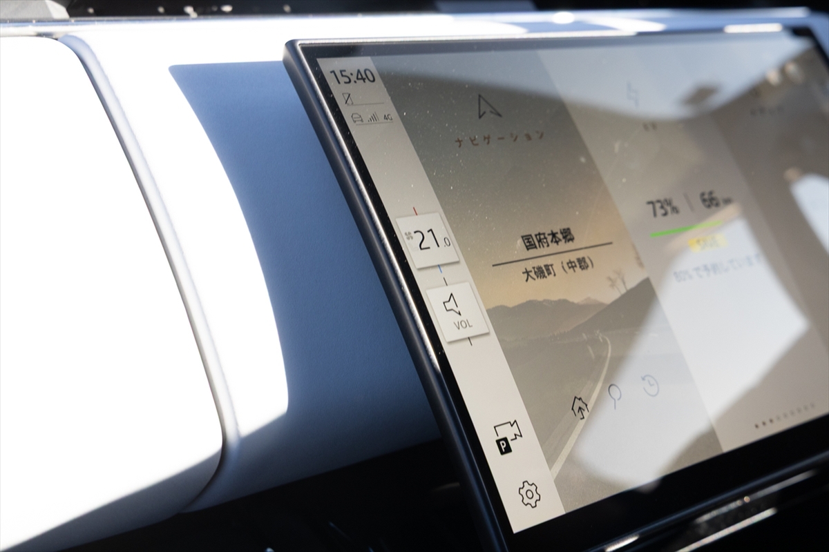 こちらもラグジーな室内。ホワイトレザーにイイモノ感が漂います。座り心地はソファーそのものといったところで、かなりフカフカです。メーターはフル液晶ですが、最近流行りのカーブドディスプレイではなく平面で、日よけが用意されるコンサバティブなタイプ