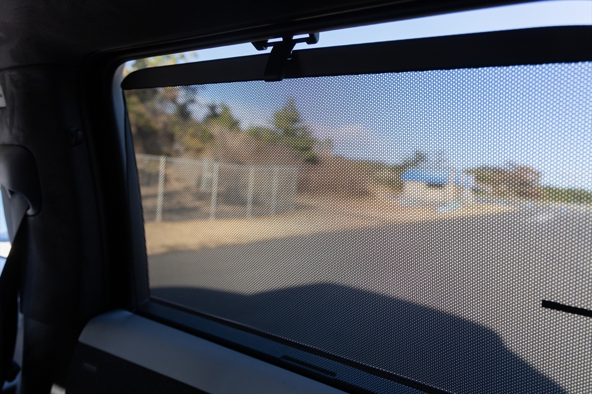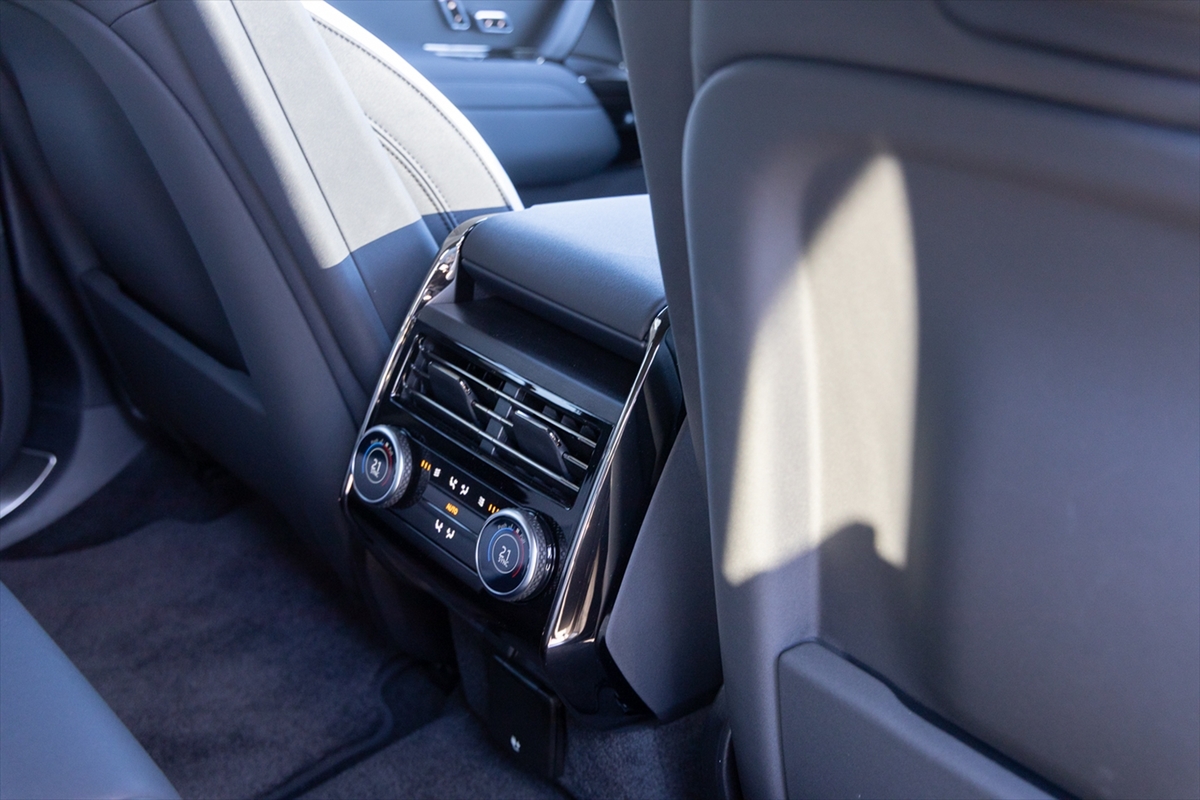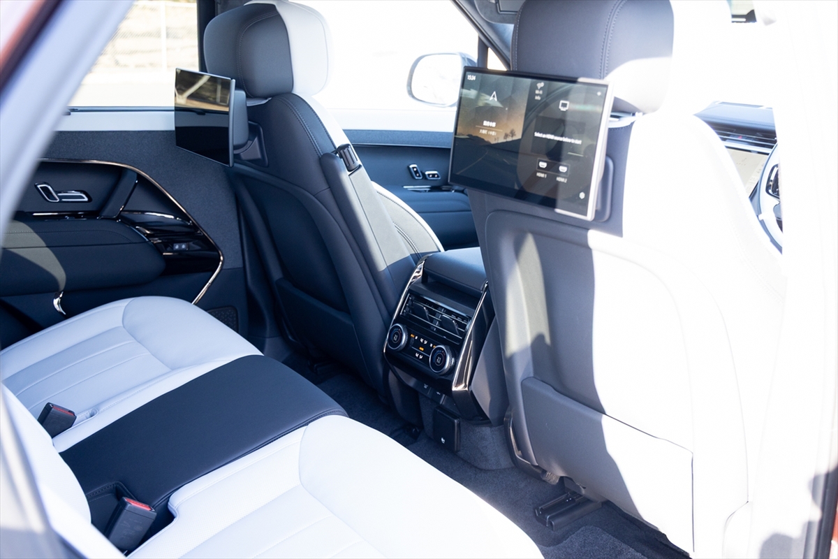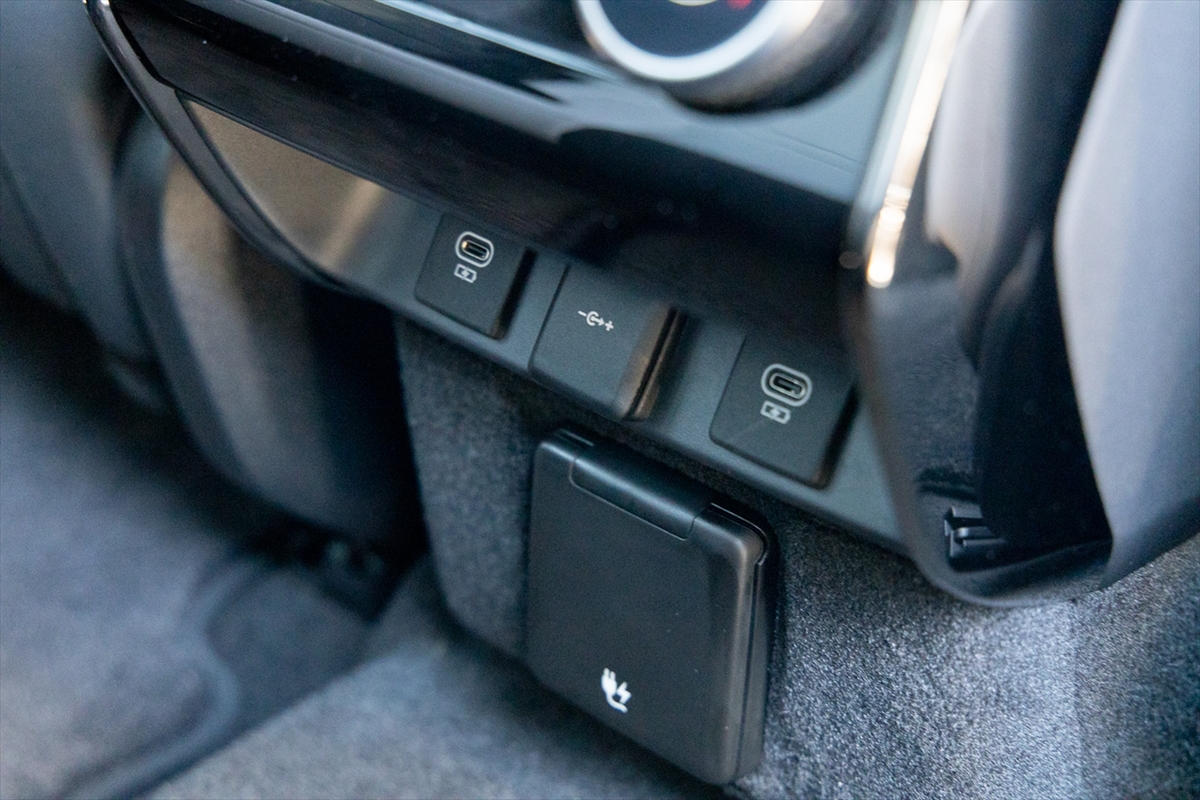 後席は快適かつ広々とした空間。ACアウトレットも用意されています。ちなみに写真に写るACアウトレット(2万1000円)と11.4インチのリアシートエンターテインメントはオプション(43万3000円)です。