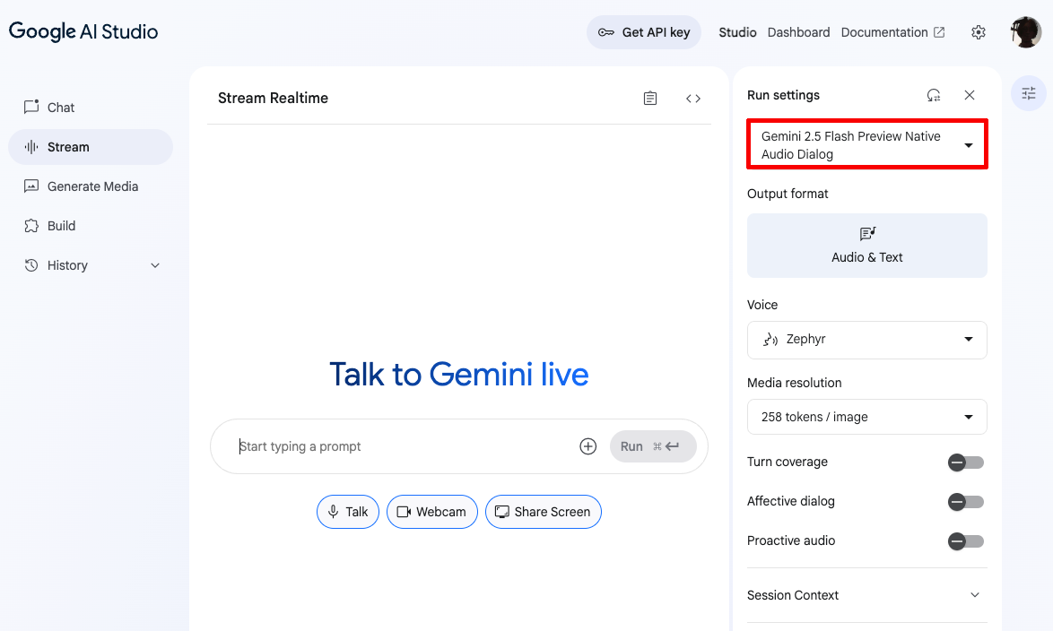現在利用できるのは下記の3モデル。通常はデフォルトのGemini 2.5 Flash Preview Native Audio Dialogを選んでおけばよい。