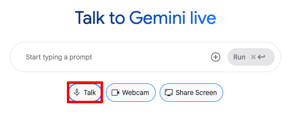 Google AI Studioで注目すべき機能の一つが、Gemini 2.5の「Native Audio Output」を活用した、音声で話しかけると自然な音声で返答してくれるリアルタイム音声対話機能だ。日本語を含む24言語以上に対応しているため、英語が苦手でも安心して利用できる。