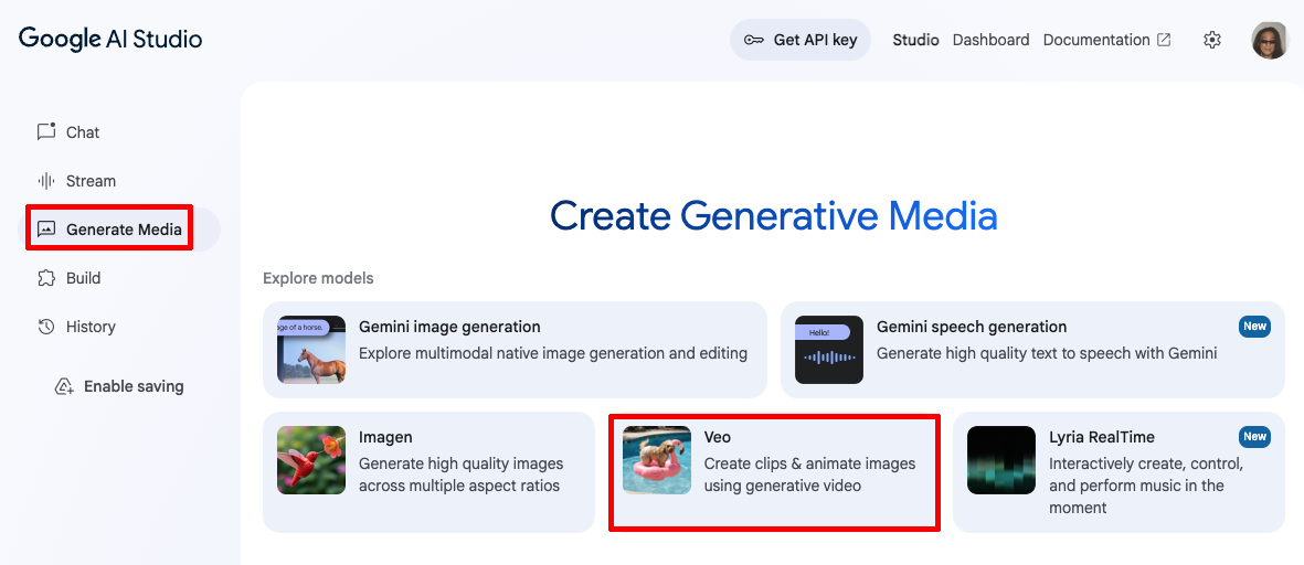Google AI Studioのサイドメニューから「Generate Media」を選択し、「Veo」をクリックする。