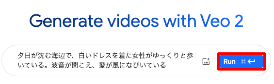 テキスト入力欄に、作りたい動画の内容を日本語で記述し「Run」をクリックすることで生成が開始される。