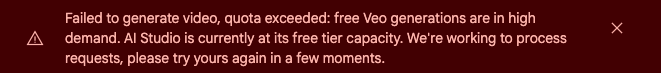 無料版のVeo 2は需要が高く、混雑時(特に日本時間の夜間や週末)はサーバー処理能力の上限に達し、一時的に利用できない場合がある。その際は数分〜数時間待ってから再試行することで利用可能になる。