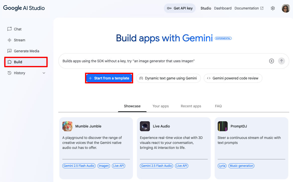 「Build」タブでは、用意されたテンプレートを選び、自然言語で指示を出すだけで簡単なWebアプリケーションを作成できる。基本的なプログラミング知識すら不要なのだ。