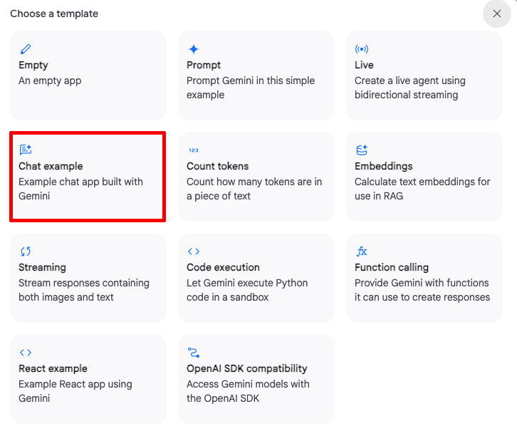 テンプレートが一覧表示される。今回は「Chat example」テンプレートを試してみよう。