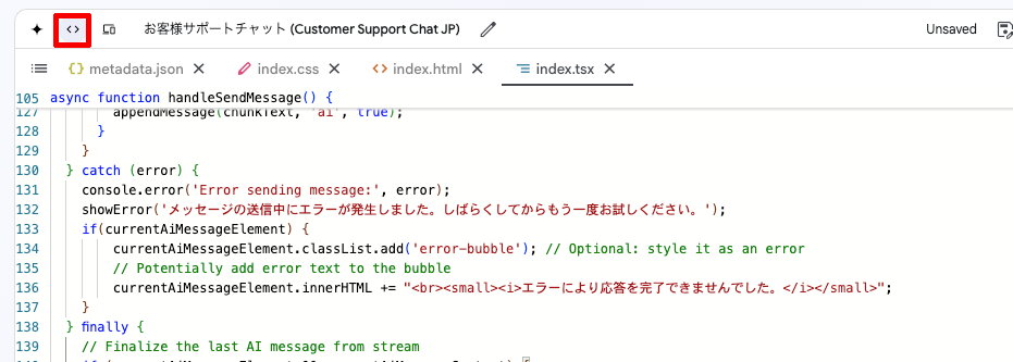 では、サンプルアプリをノーコードで改造していこう。code assistantを開いて下記のプロンプトを入力して実行。