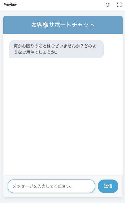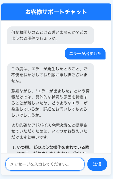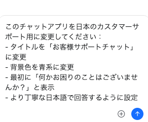 プロンプト:このチャットアプリを日本のカスタマーサポート用に変更してください: - タイトルを「お客様サポートチャット」に変更 - 背景色を青系に変更 - 最初に「何かお困りのことはございませんか?」と表示 - より丁寧な日本語で回答するように設定