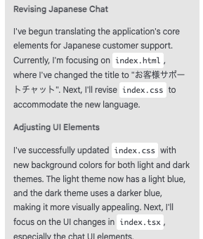 展開することで思考内容を確認できる。「index.html」「index.css」などを日本語に変換する方法について検討しているようだ。