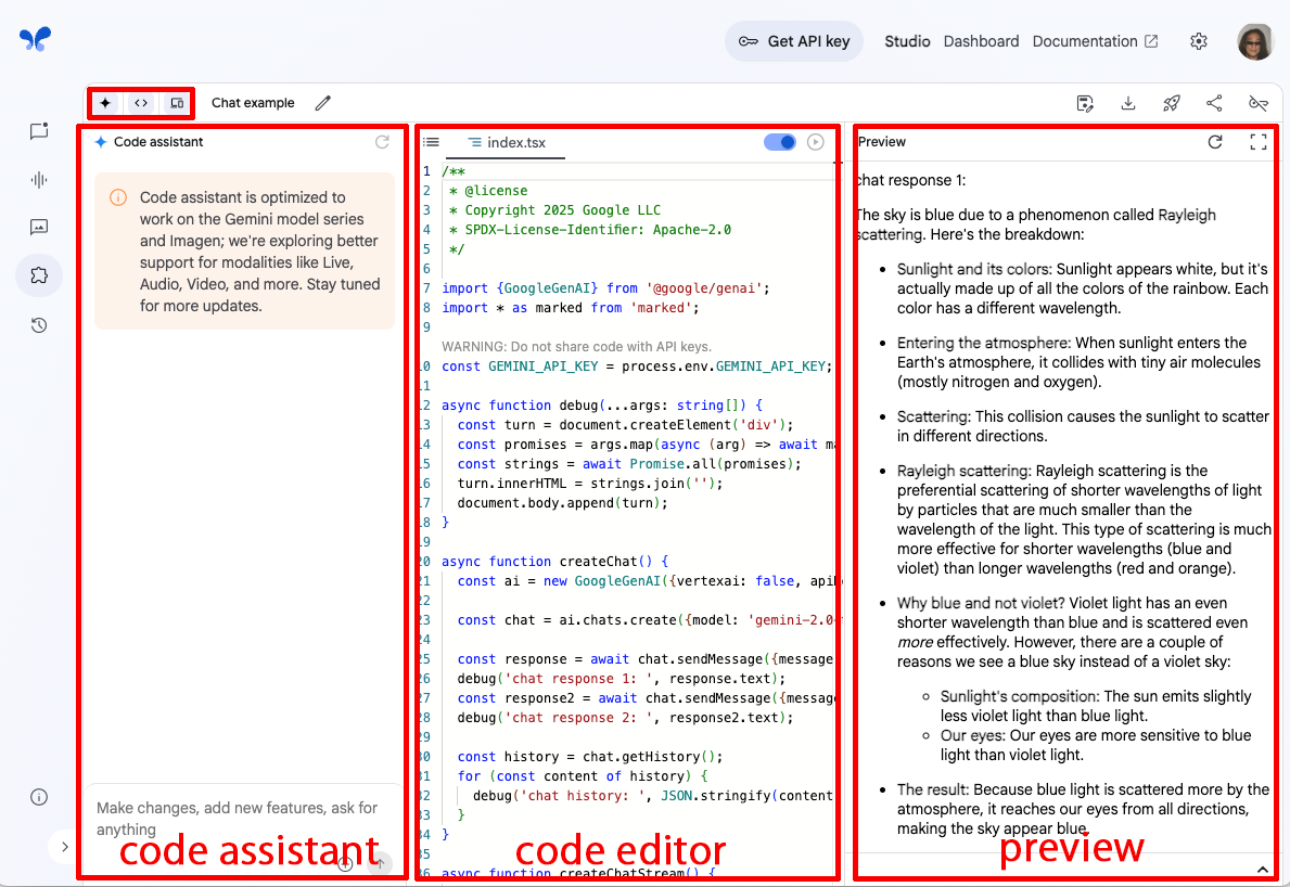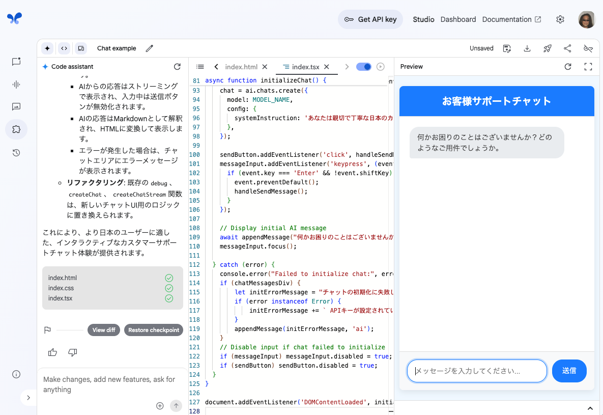 「Chat example」テンプレートが表示された。画面は縦に三分割されており、左側がGeminiを使ったチャットウィンドウ「code assistant(チャット)」、真ん中がプログラムコード自体を表示・編集する「code editor(コード)」、右側がプログラムの実行結果を表示する「preview(プレビュー)」の画面になっている。