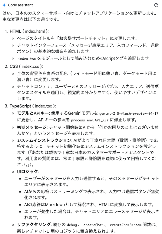 チャット画面には変更内容がぎっしり記述されているのでプログラミングの勉強に役立てることもできる。