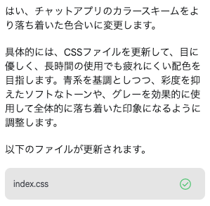 追加修正も自然言語で可能。色味を少し変更してもらいたいので下記プロンプトを実行。