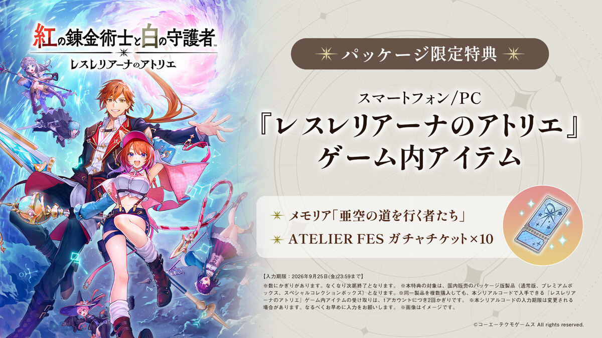 早期購入特典には男女主人公の専用衣装と探索道具が、パッケージ特典にはアプリ版「レスレリ」向けのメモリアやガチャチケットが付属する。