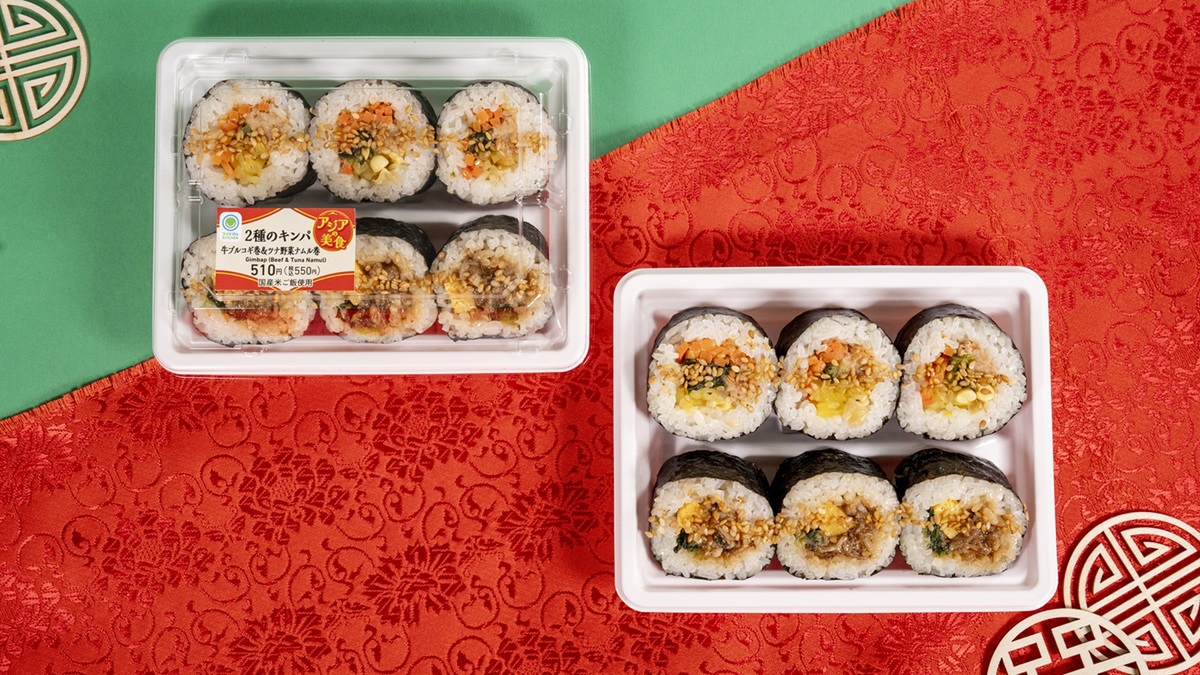 韓国料理からは「2種のキンパ」が登場。ごま油香るツナ野菜ナムルキンパと、炙り焼き牛プルコギキンパの2種類が入ったボリューム満点の一皿です。